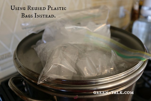 The second time, I put ice in freezer plastic bags that I re-use over and over. Stuff the bags in the freezer for when I needed them during the recipe. (I am such a girl scout.)