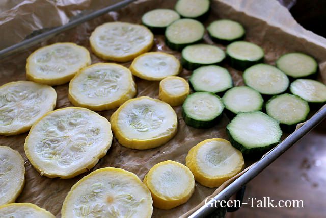 2.  Then lay them side by side in single rows on a cookie sheet and place parchment paper between each layer. I generally can put about four rows of zucchini on one cookie sheet.